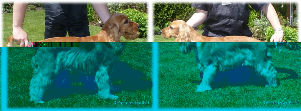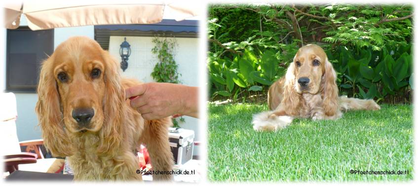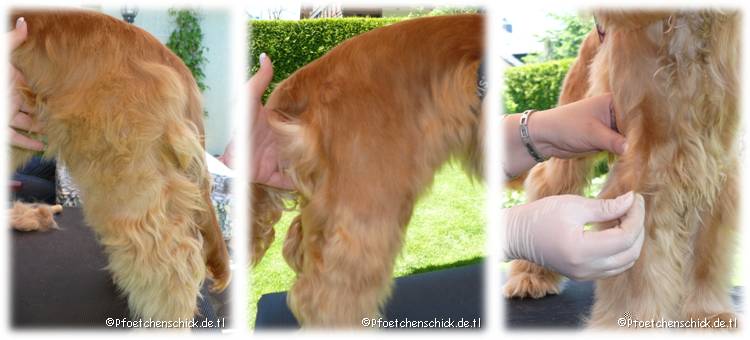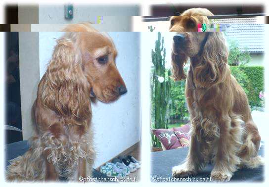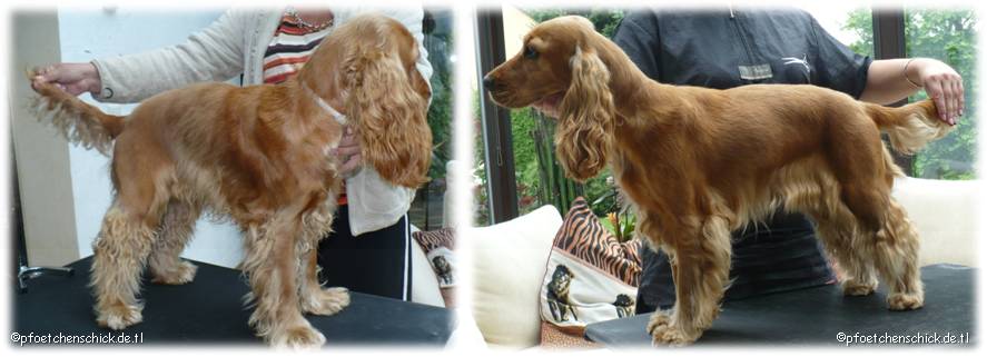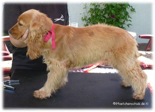 Bei Bella erfolgt das Trimmen per Hand. Die Haare werden von Hand gezupft. Nur an der Kehle und am Innenohr wird mit der Maschine bzw. Schere gearbeitet.