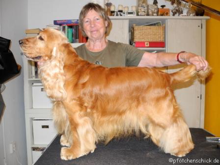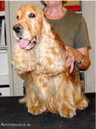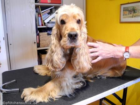 Bobby durfte ich im September 2013 das erste Mal trimmen. Vorher war er eher “Ami-Cocker-Like” geschnitten. Brav lies er sich überflüssige Haare auszupfen, abschneiden oder abscheren. Der süße Blondschopf bleibt auf Frauchen-Wunsch etwas länger als sonst.